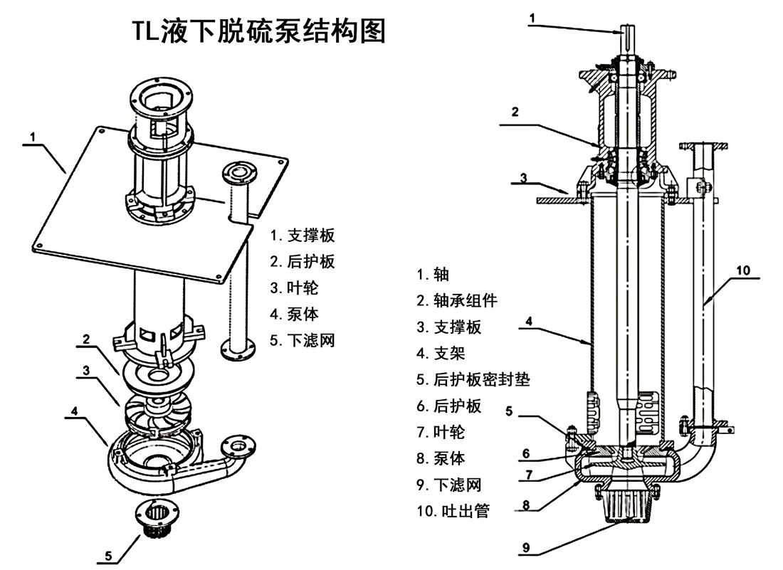 TL系列立式脫硫泵為立式、軸向吸入、單級、單吸、單殼體、離心式結(jié)構(gòu)。具有效率高、節(jié)能、耐腐抗磨、振動小、噪聲低、運行可靠、壽命長等特點。適用于火力發(fā)電、鋼廠、煉鋁和煉油等行業(yè)的脫硫系統(tǒng)中輸送石灰石或石膏漿液。其允許輸送的最大漿體重量濃度Cw為60%,氯離子最高含量為60000ppm,pH值為2.5~13,漿液溫度≤65℃。